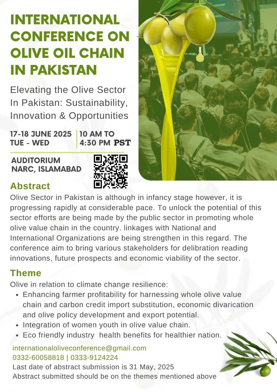 The International Conference on Olive Oil Chain in Pakistan will be held on June 17–18, 2025, at the NARC Auditorium, Islamabad. Themed around sustainability, innovation, and economic opportunities, the event will gather stakeholders to discuss climate resilience, farmer profitability, women and youth inclusion, and the development of an eco-friendly olive industry. Abstract submissions are open until May 31, 2025.